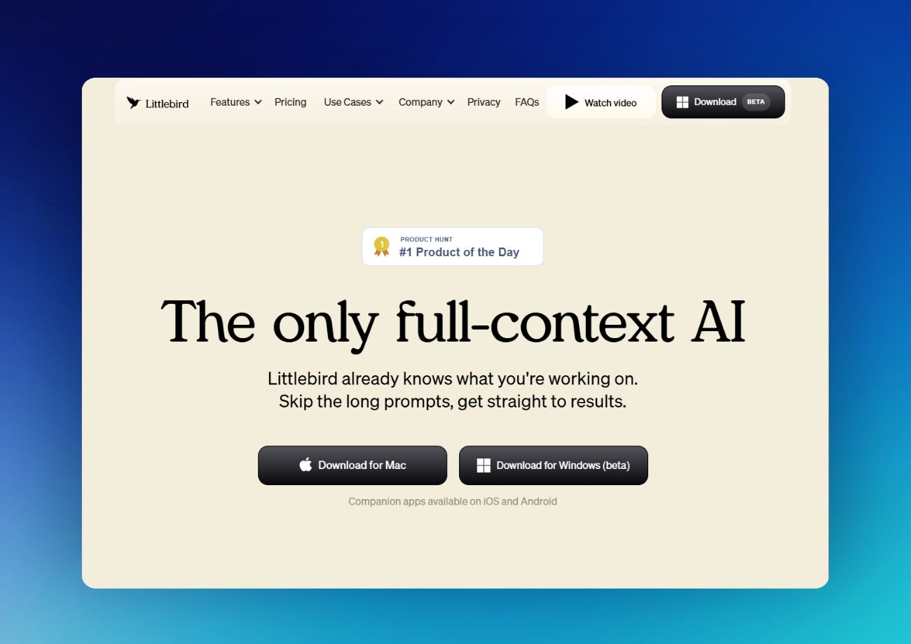 Every time you use AI, you paste in a doc, explain the project, and give it background it should already have. Littlebird learns from your screen and meetings in real time so you never have to set the scene again. Ask it anything about your work and it answers with full context. It takes meeting notes, runs daily routines, and works across Mac, Windows, iOS, and Android. No prompting gymnastics, no copy-pasting, no starting from scratch every conversation.
