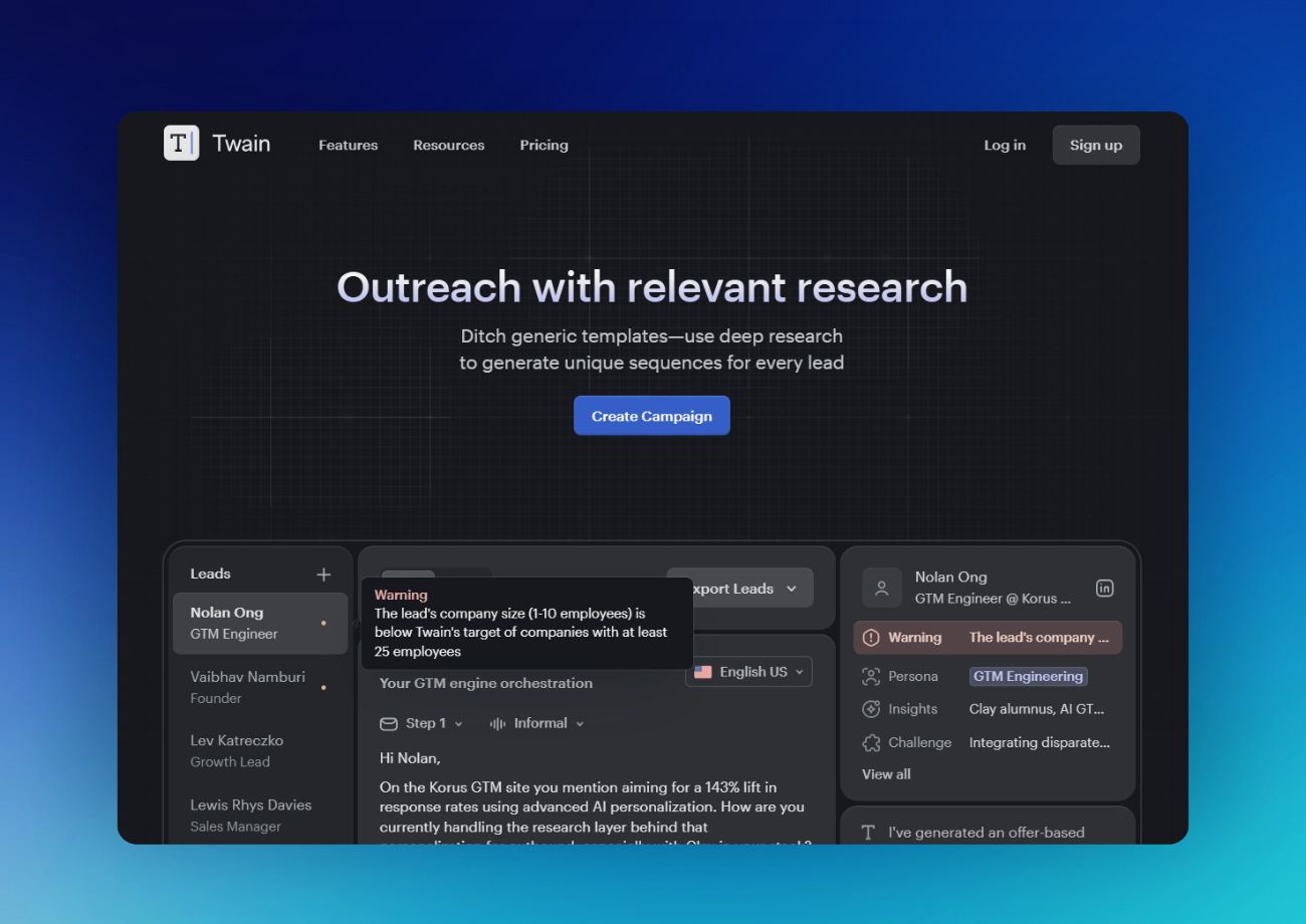 Generic sequences get ignored. The ones that land reference something specific, a recent hire, a funding round, a pain point that actually applies. Twain deep-researches every lead using live data, then generates unique email sequences tailored to each prospect. No spintax, no placeholder swaps, just messages that sound like you spent twenty minutes on each one. Plug it into your existing sequencer and scale without losing the personal touch.