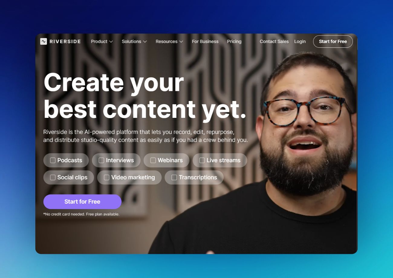 Zoom was built for conversations. That's why the recordings come out compressed, glitchy, and unusable as real content. Riverside records every guest locally in 4K video and WAV audio, so bad internet never ruins the take. Edit with AI, generate social clips, captions, show notes, and translations automatically. Trusted by Spotify, NYT, Marvel, BBC, and iHeart to produce studio-quality output without a studio.